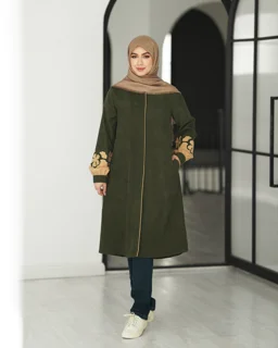 گیلدا مانتویی زنانه با طراحی خاص روی آستینها، پارچه مخمل کبریتی مرغوب، ریزش عالی و دکمه مخفی، مناسب روزمره، محیط کار و استایل محجبه. قد ۱۱۰، آستین ۶۲، اندازههای متنوع. رنگ سبز عمیق و سرآستینهای طرحدار برای ظاهری باوقار و چشمنواز.
